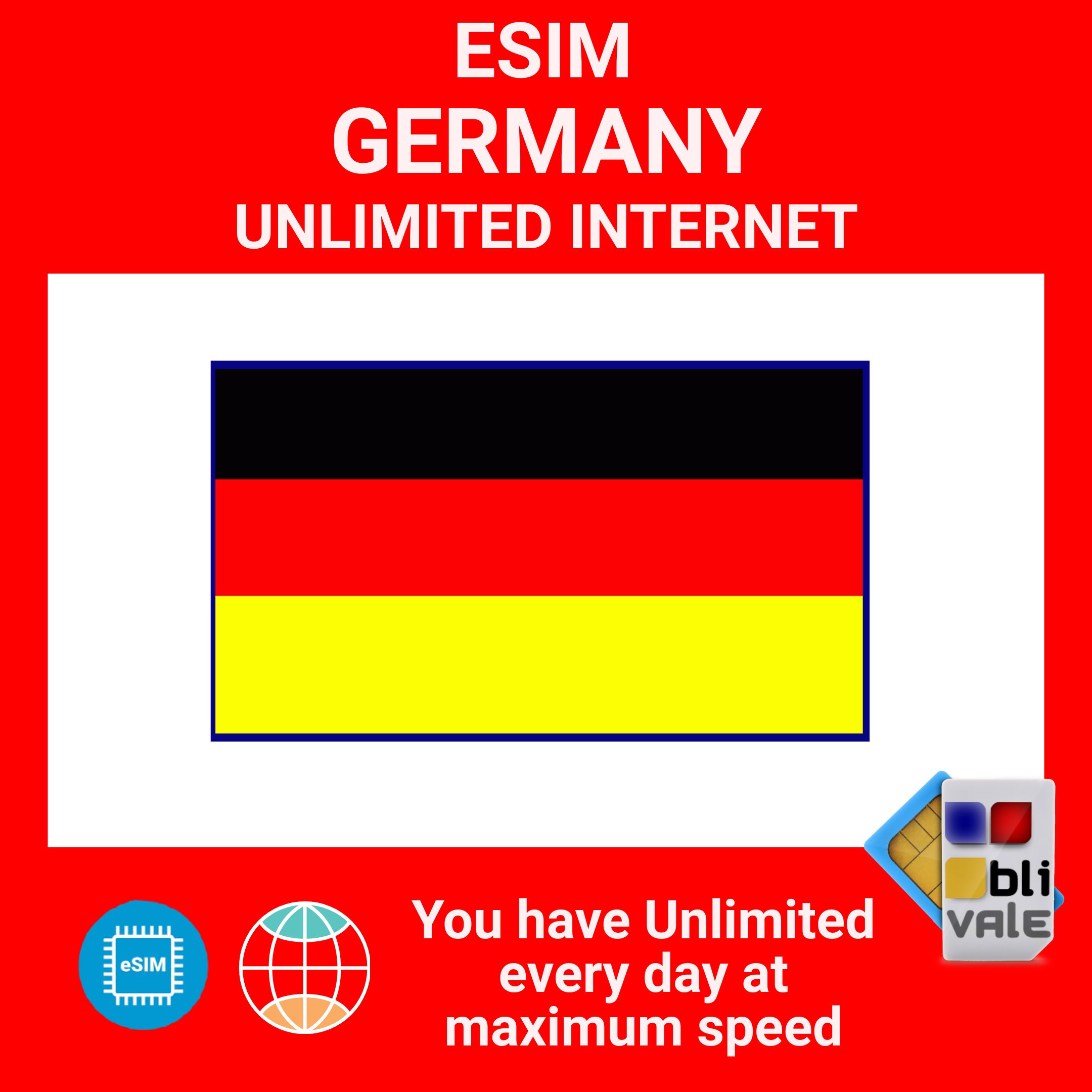 Buy an eSIM for GERMANY and enjoy unlimited internet. Get connected in minutes with unlimited data at 4G/LTE/5G speeds and stay connected with your business, colleagues, family, and friends wherever you are. Getting started with our services is easy. After your purchase, you'll receive a personalized QR code via email within 1-4 hours. Scan it with your smartphone camera, install the eSIM, and enjoy fast, stable, unlimited internet. Your SIM activates automatically! Install the eSIM before your trip, put your smartphone in airplane mode during the flight, and reactivate your internet connection upon arrival at your destination. Start browsing and using your apps with the BLIVALE eSIM.