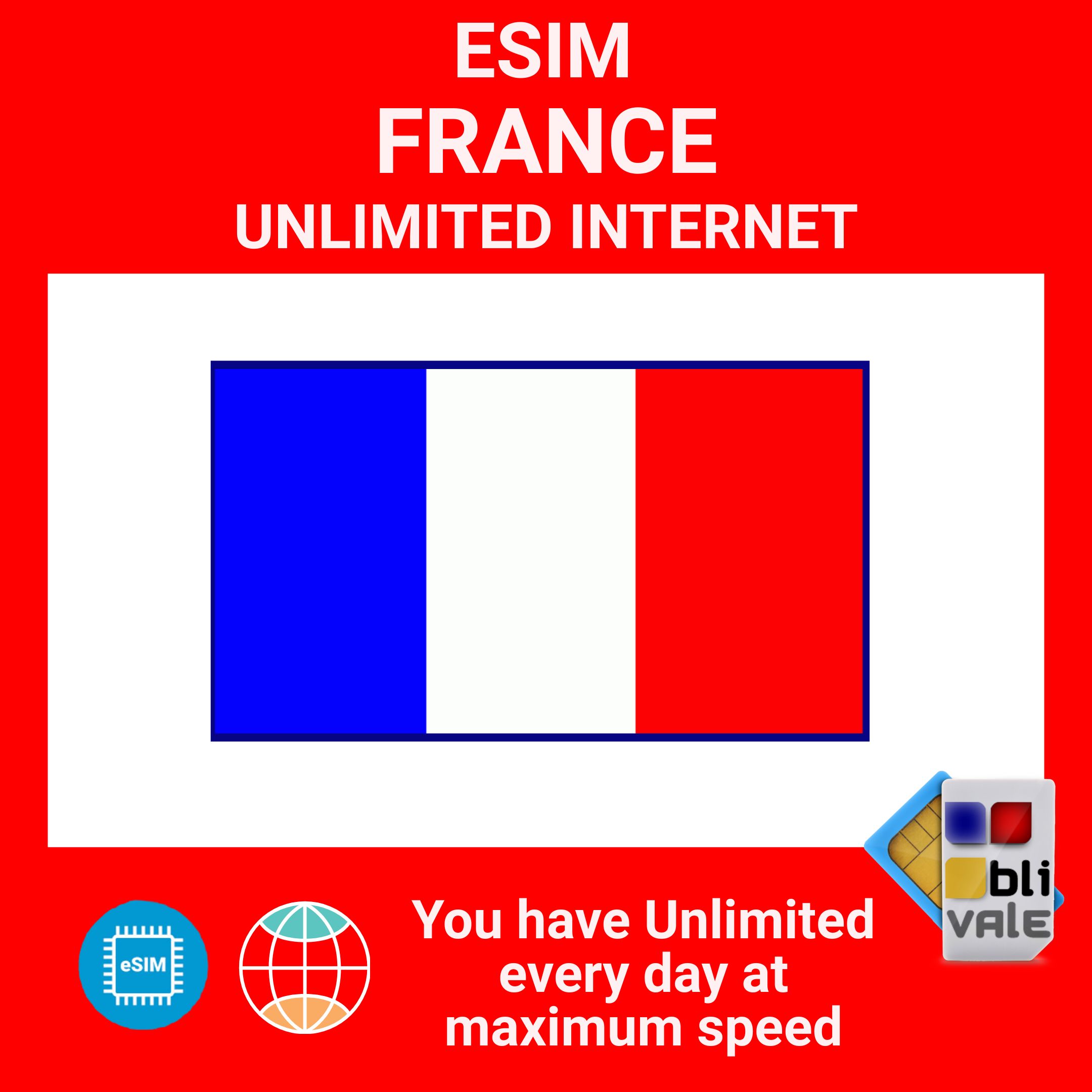 Buy an eSIM for FRANCE and enjoy unlimited internet. Get connected in minutes with unlimited data at 4G/LTE/5G speeds and stay connected with your business, colleagues, family, and friends wherever you are. Getting started with our services is easy. After your purchase, you'll receive a personalized QR code via email within 1-4 hours. Scan it with your smartphone camera, install the eSIM, and enjoy fast, stable, unlimited internet. Your SIM activates automatically! Install the eSIM before your trip, put your smartphone in airplane mode during the flight, and reactivate your internet connection upon arrival at your destination. Start browsing and using your apps with the BLIVALE eSIM.